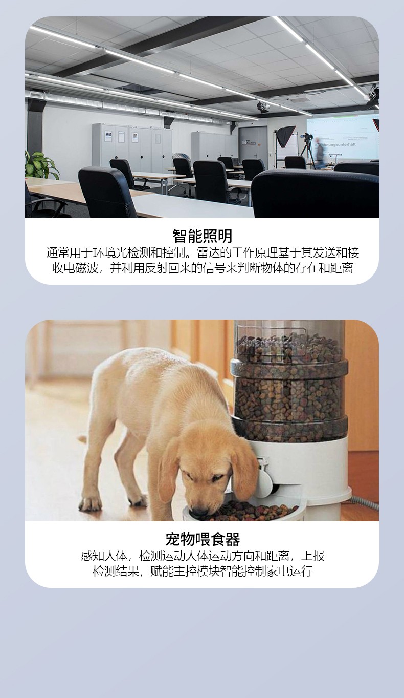 FR58L4LS-2020M-2 簡稱 2020M 是飛睿智能推出的高性能低功耗 5.8G 雷達傳感器,雷達模塊利用多普勒原理,通過天線發(fā)射高頻電磁波并接收初期反射波,以此判斷覆蓋范圍內(nèi)物體的移動,給出相應(yīng)電信號。模塊尺寸 20*20MM,該模塊集成了 5.8G 微波電路、中頻放大電路以及信號處理器,集成度高且生產(chǎn)一致性好,模塊內(nèi)置32 位 MCU 和收發(fā)天線,大大提高了傳感器的感應(yīng)性能。雷達模塊感應(yīng)距離遠、角度廣、無死區(qū)、透鏡和透鏡老化問題不受溫度、濕度、氣流、灰塵、噪聲、亮暗等影響。模塊內(nèi)植入濾雨樹葉算法,能過濾掉雨水樹葉的誤觸發(fā),性能穩(wěn)定,廣泛應(yīng)用于智慧照明、智慧安防等多個領(lǐng)域。