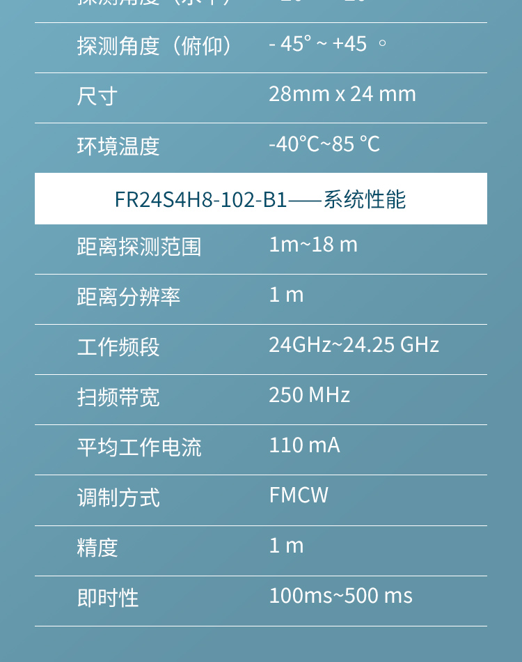 FR24S4H8-102-B1 簡稱 102 是飛睿智能設(shè)計的無人機避障傳感器,包含 24G 雷達(dá)傳感器硬件和智能算法固件。FR24S4H8-102-B1 硬件搭載高性能 24GHz 一發(fā)一收天線和外圍電路;采用毫米波雷達(dá)距離測量技術(shù)和高性能芯片先進(jìn)的專有信號處理技術(shù)。