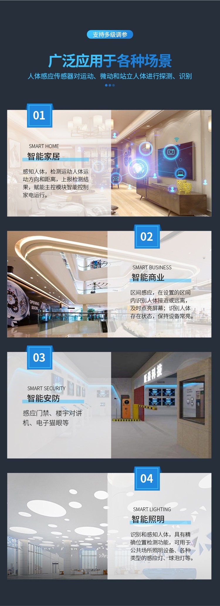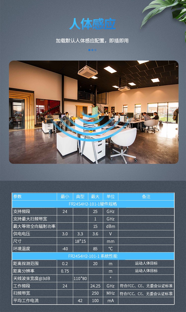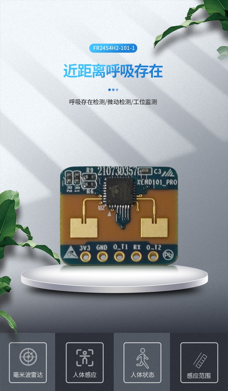 FR24S4H2-101-1 是飛睿智能設(shè)計的人體感應(yīng)傳感器,包含極簡化 24G 雷達(dá)傳感器硬件和智能算法固件。硬件搭載高性能 24GHz 一發(fā)一收天線和外圍電路;人體感應(yīng)算法,采用毫米波雷達(dá)距離測量技術(shù)和高性能芯片先進的專有信號處理技術(shù),實現(xiàn)對運動、微動和站立人體的精確感知。固件主要應(yīng)用在室內(nèi)場景,感知區(qū)域內(nèi)是否有運動或者微動的人體,實時刷新檢測結(jié)果。對運動人體的最遠(yuǎn)感應(yīng)距離為 20 米,可輕松配置感應(yīng)距離范圍、不同區(qū)間的感應(yīng)靈敏度及刷新時間,支持 GPIO 和 UART 接口,即插即用,靈活應(yīng)用于不同的智能場景和終端產(chǎn)品。